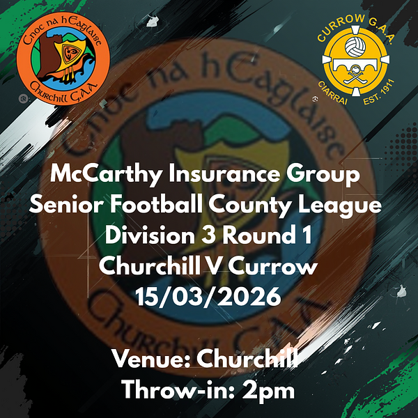 The 2026 McCarthy Insurance County Football League Division 3 commences this afternoon for our Senior Footballers. It is a home venue for Round One with a throw-in time of 2pm in the New Pitch in Churchill.